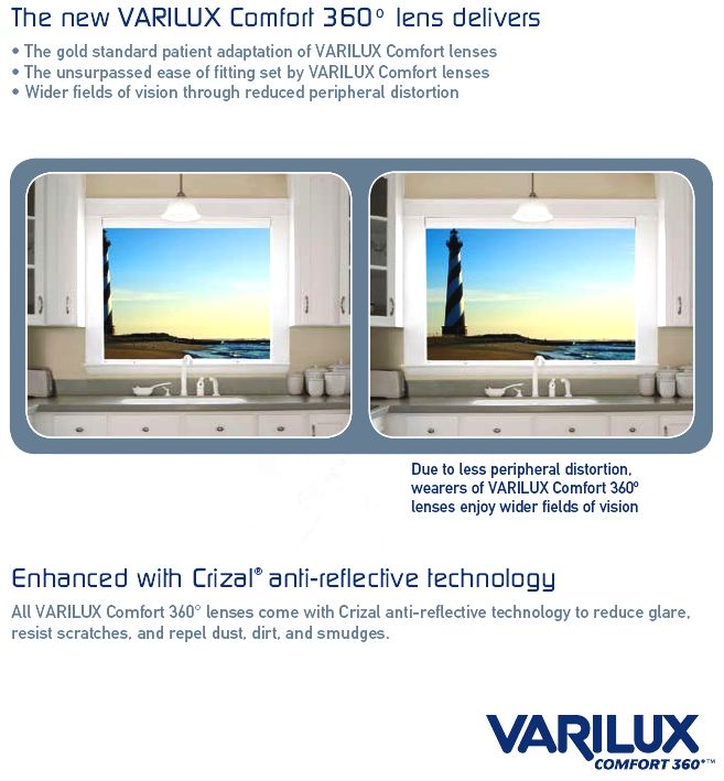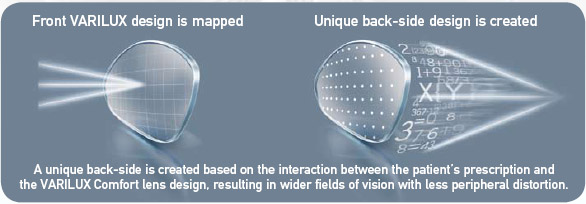 When a distance prescription is added to any lens, peripheral distortion increases and vision fields decrease. Through the patented 360º Digital Surfacing process, VARILUX Comfort 360° lenses eliminate to provide wider fields of vision and less peripheral distortion. How is this accomplished? When each new VARILUX Comfort 360° lens is created, a unique back-side is designed to the patient’s individual prescription. This design is then applied using patented 360° Digital Surfacing technology to ensure that the interaction between the front-side VARILUX Comfort lens design and the back-side prescription provides a new level of superior vision.